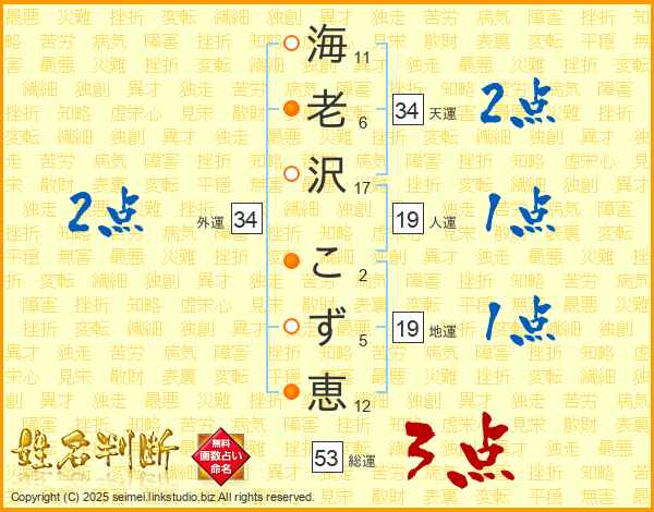 海(11画)老(6画)沢(17画) こ(2画)ず(5画)恵(12画)