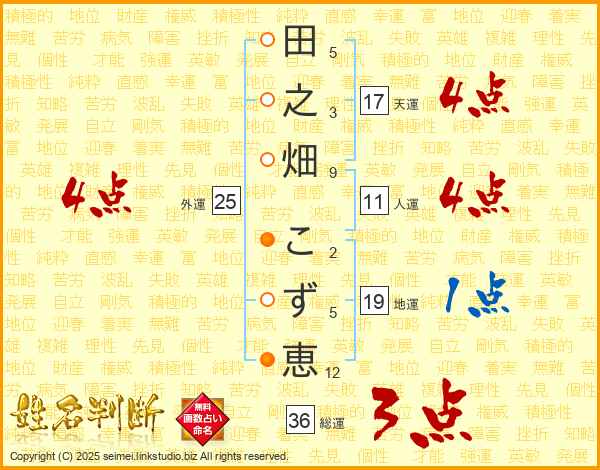 田(5画)之(3画)畑(9画) こ(2画)ず(5画)恵(12画)