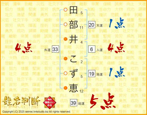 生活面を象徴する運勢です。外部から受ける影響力を表し、結婚運、家庭運や職場、環境への順応性を表します。総運から人運を引いた画数。姓や名が1文字の場合を除く。