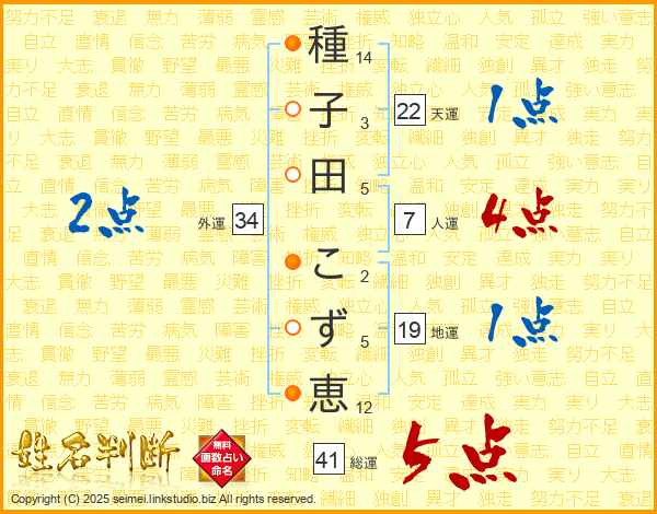 種(14画)子(3画)田(5画) こ(2画)ず(5画)恵(12画)