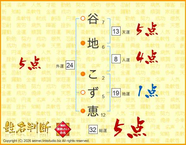 谷(7画)地(6画) こ(2画)ず(5画)恵(12画)