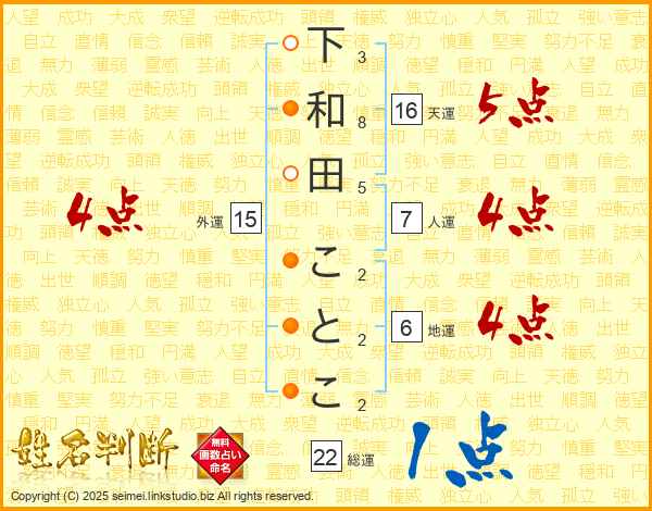 生活面を象徴する運勢です。外部から受ける影響力を表し、結婚運、家庭運や職場、環境への順応性を表します。総運から人運を引いた画数。姓や名が1文字の場合を除く。