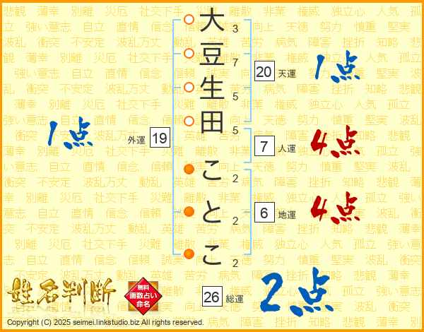 大豆生田ことこさんの総運は26画の2点!