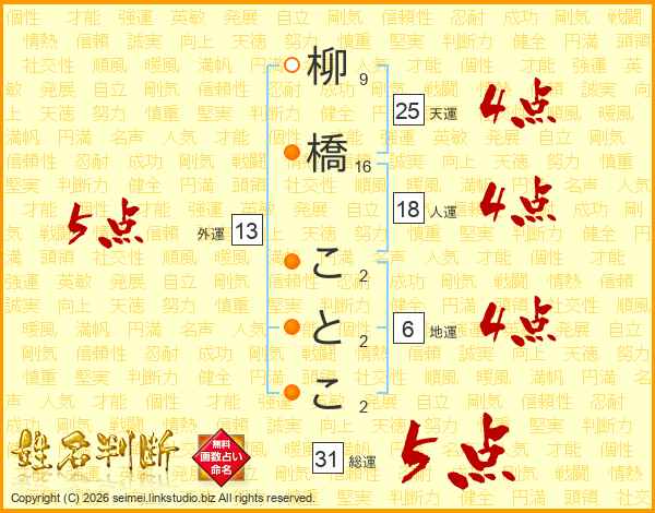 柳(9画)橋(16画) こ(2画)と(2画)こ(2画)