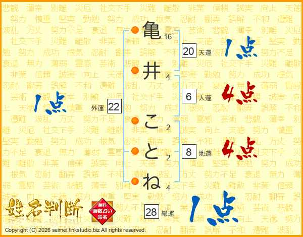 亀(16画)井(4画) こ(2画)と(2画)ね(4画)
