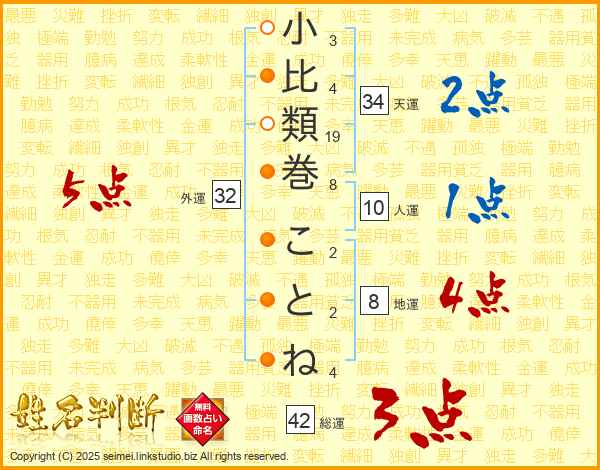 小(3画)比(4画)類(19画)巻(8画) こ(2画)と(2画)ね(4画)