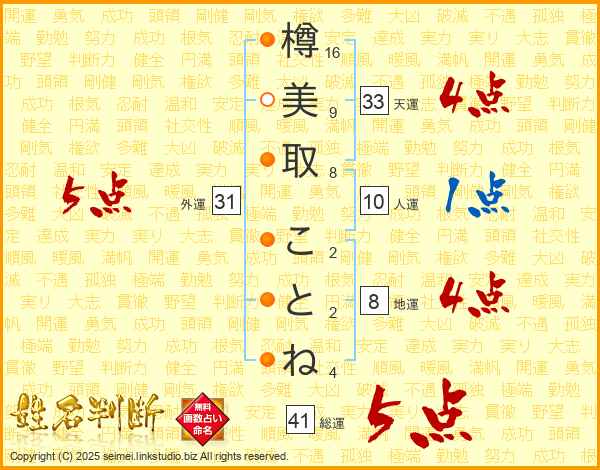 樽(16画)美(9画)取(8画) こ(2画)と(2画)ね(4画)