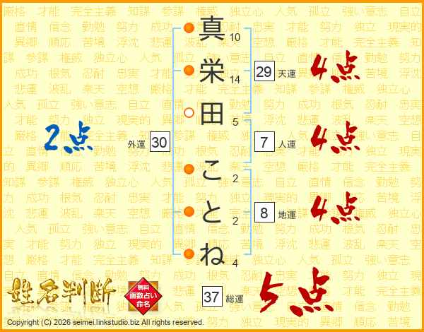 真(10画)栄(14画)田(5画) こ(2画)と(2画)ね(4画)