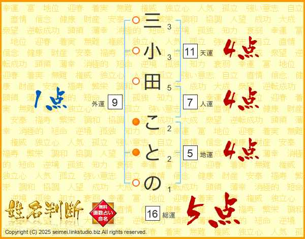 生活面を象徴する運勢です。外部から受ける影響力を表し、結婚運、家庭運や職場、環境への順応性を表します。総運から人運を引いた画数。姓や名が1文字の場合を除く。