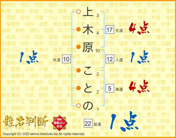生活面を象徴する運勢です。外部から受ける影響力を表し、結婚運、家庭運や職場、環境への順応性を表します。総運から人運を引いた画数。姓や名が1文字の場合を除く。