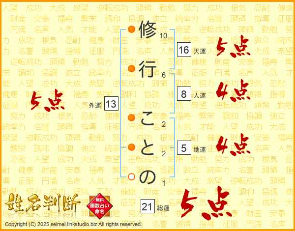 修行ことのさんの総運は21画の5点!