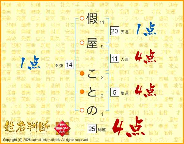 生活面を象徴する運勢です。外部から受ける影響力を表し、結婚運、家庭運や職場、環境への順応性を表します。総運から人運を引いた画数。姓や名が1文字の場合を除く。