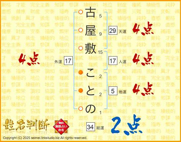 生活面を象徴する運勢です。外部から受ける影響力を表し、結婚運、家庭運や職場、環境への順応性を表します。総運から人運を引いた画数。姓や名が1文字の場合を除く。