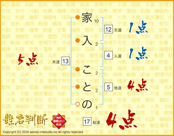 生活面を象徴する運勢です。外部から受ける影響力を表し、結婚運、家庭運や職場、環境への順応性を表します。総運から人運を引いた画数。姓や名が1文字の場合を除く。