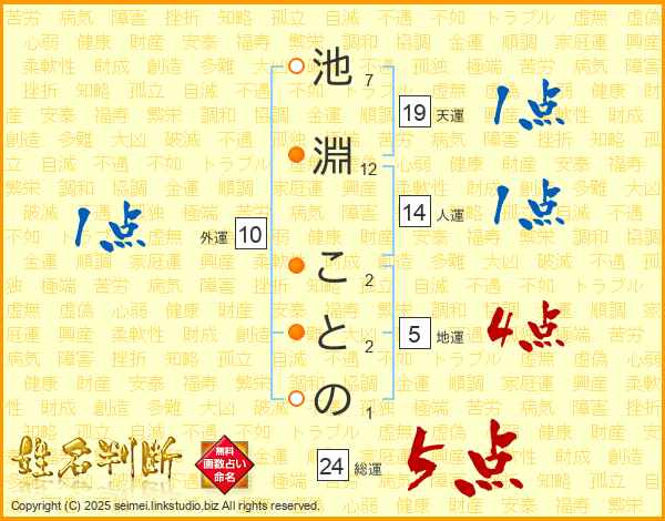 生活面を象徴する運勢です。外部から受ける影響力を表し、結婚運、家庭運や職場、環境への順応性を表します。総運から人運を引いた画数。姓や名が1文字の場合を除く。