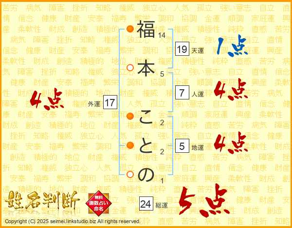 生活面を象徴する運勢です。外部から受ける影響力を表し、結婚運、家庭運や職場、環境への順応性を表します。総運から人運を引いた画数。姓や名が1文字の場合を除く。