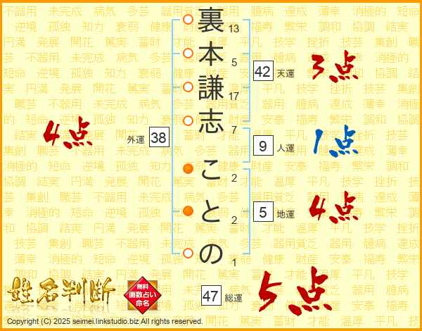 裏(13画)本(5画)謙(17画)志(7画) こ(2画)と(2画)の(1画)