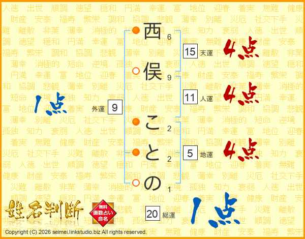 生活面を象徴する運勢です。外部から受ける影響力を表し、結婚運、家庭運や職場、環境への順応性を表します。総運から人運を引いた画数。姓や名が1文字の場合を除く。