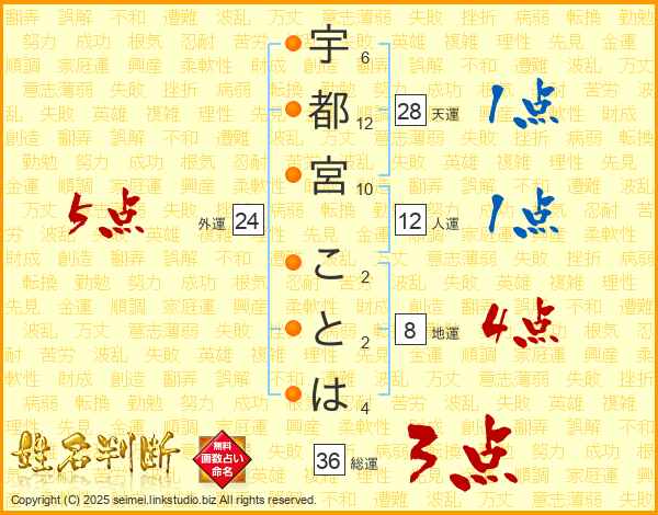 生活面を象徴する運勢です。外部から受ける影響力を表し、結婚運、家庭運や職場、環境への順応性を表します。総運から人運を引いた画数。姓や名が1文字の場合を除く。
