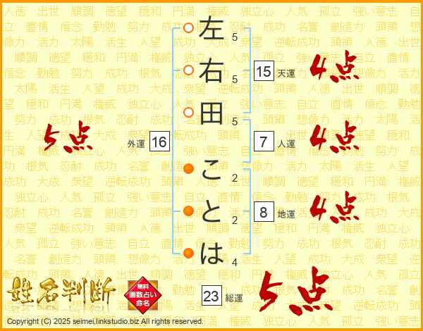 生活面を象徴する運勢です。外部から受ける影響力を表し、結婚運、家庭運や職場、環境への順応性を表します。総運から人運を引いた画数。姓や名が1文字の場合を除く。