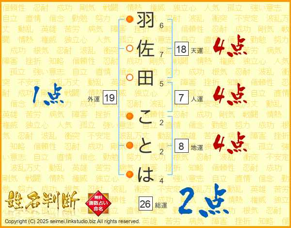 羽(6画)佐(7画)田(5画) こ(2画)と(2画)は(4画)