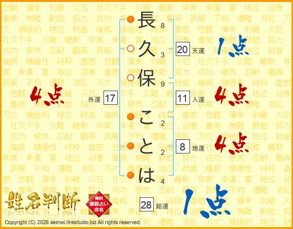 生活面を象徴する運勢です。外部から受ける影響力を表し、結婚運、家庭運や職場、環境への順応性を表します。総運から人運を引いた画数。姓や名が1文字の場合を除く。