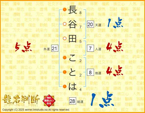 生活面を象徴する運勢です。外部から受ける影響力を表し、結婚運、家庭運や職場、環境への順応性を表します。総運から人運を引いた画数。姓や名が1文字の場合を除く。
