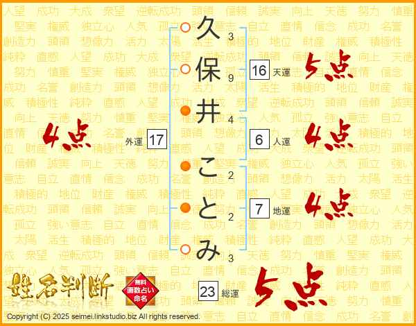 久保井ことみさんの総運は23画の5点!