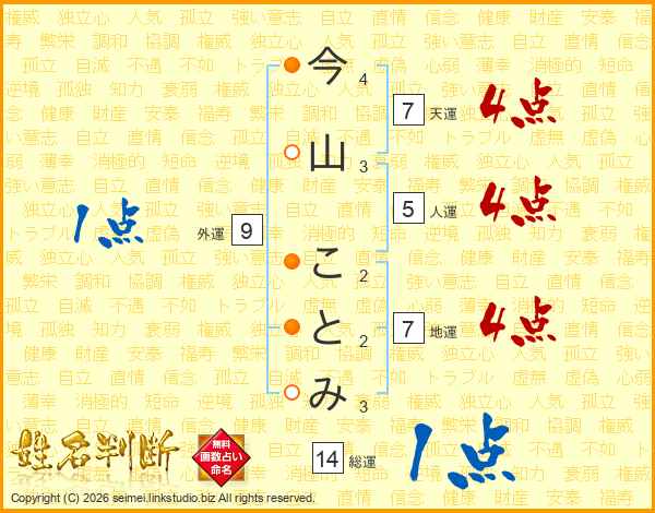 今山ことみさんの総運は14画の1点!