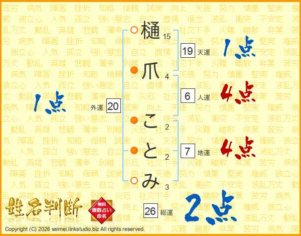 生活面を象徴する運勢です。外部から受ける影響力を表し、結婚運、家庭運や職場、環境への順応性を表します。総運から人運を引いた画数。姓や名が1文字の場合を除く。