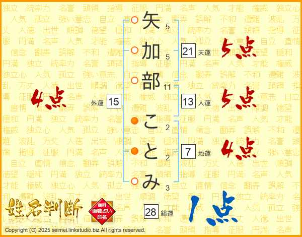 矢加部ことみさんの総運は28画の1点!
