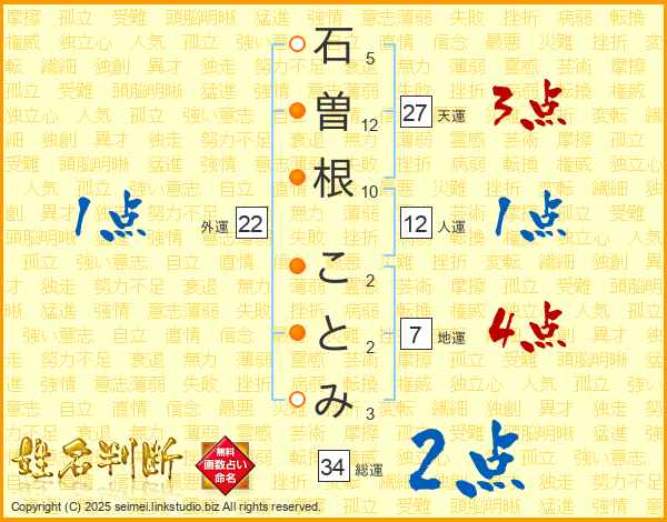 石(5画)曽(12画)根(10画) こ(2画)と(2画)み(3画)