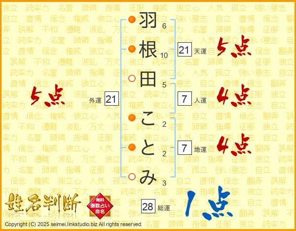 羽(6画)根(10画)田(5画) こ(2画)と(2画)み(3画)
