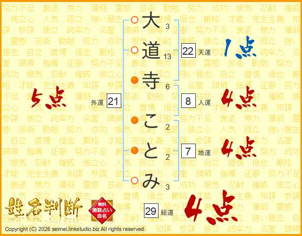生活面を象徴する運勢です。外部から受ける影響力を表し、結婚運、家庭運や職場、環境への順応性を表します。総運から人運を引いた画数。姓や名が1文字の場合を除く。