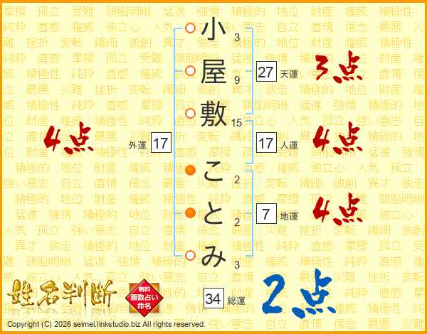 生活面を象徴する運勢です。外部から受ける影響力を表し、結婚運、家庭運や職場、環境への順応性を表します。総運から人運を引いた画数。姓や名が1文字の場合を除く。