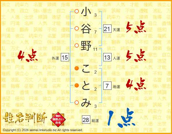 生活面を象徴する運勢です。外部から受ける影響力を表し、結婚運、家庭運や職場、環境への順応性を表します。総運から人運を引いた画数。姓や名が1文字の場合を除く。