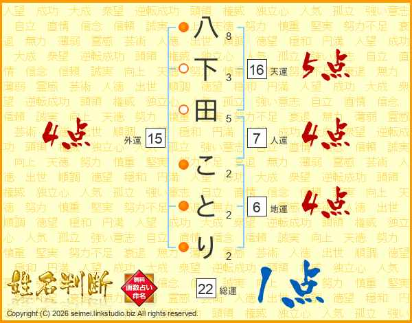 八下田ことりさんの総運は22画の1点!