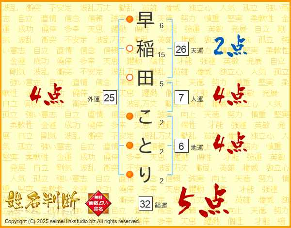 生活面を象徴する運勢です。外部から受ける影響力を表し、結婚運、家庭運や職場、環境への順応性を表します。総運から人運を引いた画数。姓や名が1文字の場合を除く。