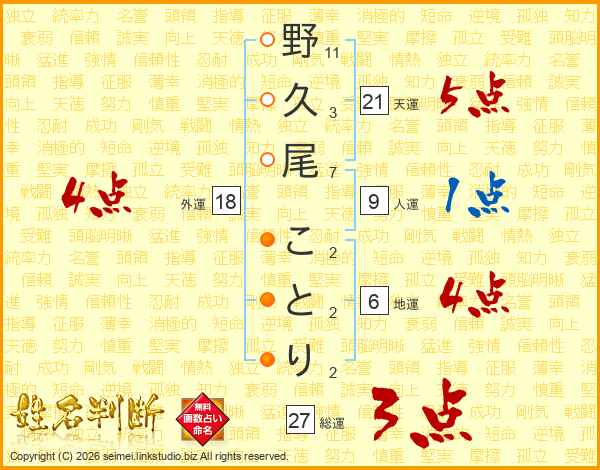 生活面を象徴する運勢です。外部から受ける影響力を表し、結婚運、家庭運や職場、環境への順応性を表します。総運から人運を引いた画数。姓や名が1文字の場合を除く。