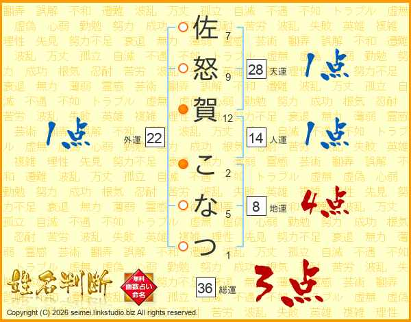 佐(7画)怒(9画)賀(12画) こ(2画)な(5画)つ(1画)