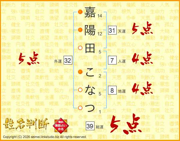 嘉陽田こなつさんの総運は39画の5点!