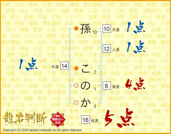 生活面を象徴する運勢です。外部から受ける影響力を表し、結婚運、家庭運や職場、環境への順応性を表します。総運から人運を引いた画数。姓や名が1文字の場合を除く。