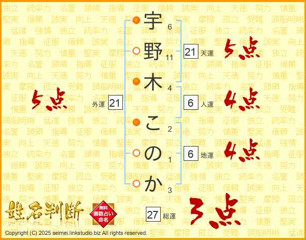 宇(6画)野(11画)木(4画) こ(2画)の(1画)か(3画)