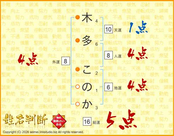 木多このかさんの総運は16画の5点!