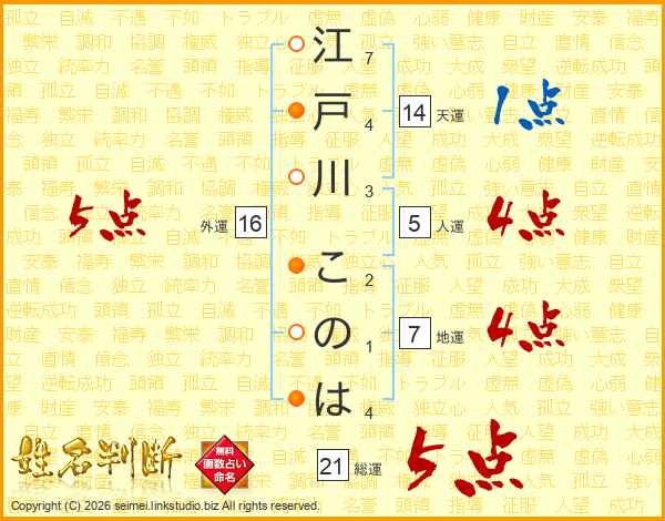 生活面を象徴する運勢です。外部から受ける影響力を表し、結婚運、家庭運や職場、環境への順応性を表します。総運から人運を引いた画数。姓や名が1文字の場合を除く。