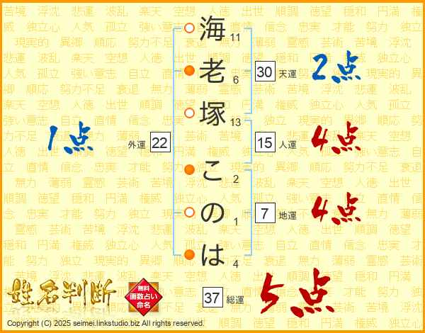 生活面を象徴する運勢です。外部から受ける影響力を表し、結婚運、家庭運や職場、環境への順応性を表します。総運から人運を引いた画数。姓や名が1文字の場合を除く。