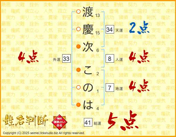 生活面を象徴する運勢です。外部から受ける影響力を表し、結婚運、家庭運や職場、環境への順応性を表します。総運から人運を引いた画数。姓や名が1文字の場合を除く。