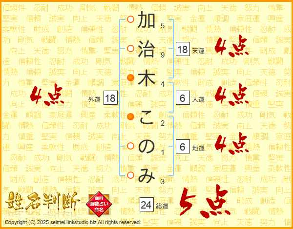 加(5画)治(9画)木(4画) こ(2画)の(1画)み(3画)