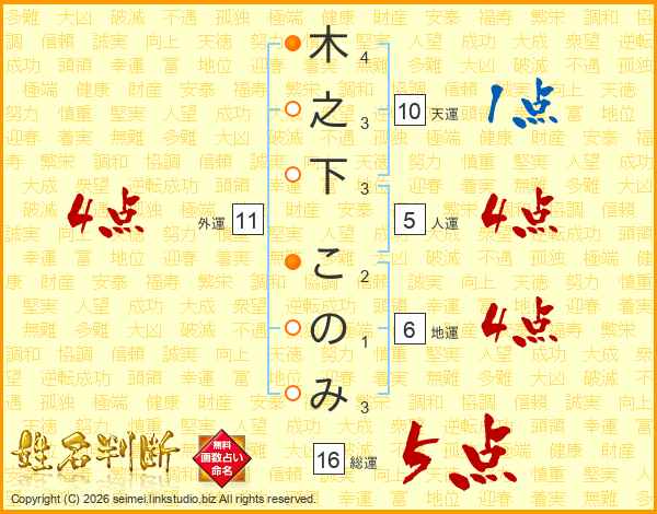 木(4画)之(3画)下(3画) こ(2画)の(1画)み(3画)