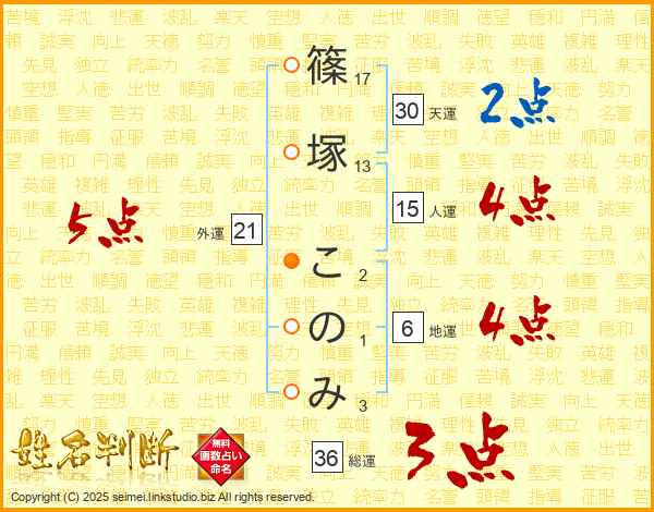 篠(17画)塚(13画) こ(2画)の(1画)み(3画)
